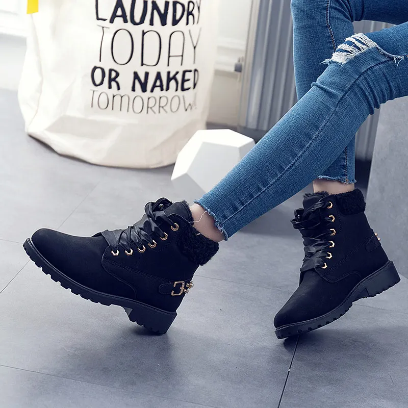 Special Offer Buty damskie zimowe 2019 nowych moda solidna z koronkowym obuwie kobieta ciepłe aksamitne botki damskie buty okrągłe toe PU śniegowce Discount 41% Today!