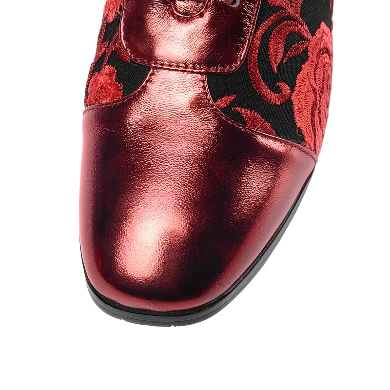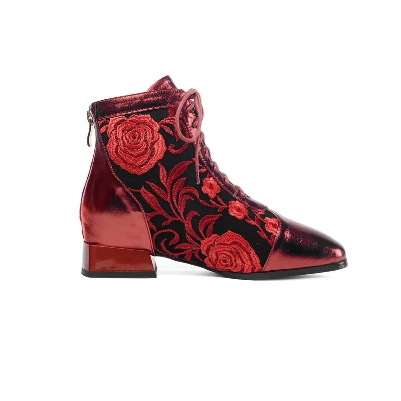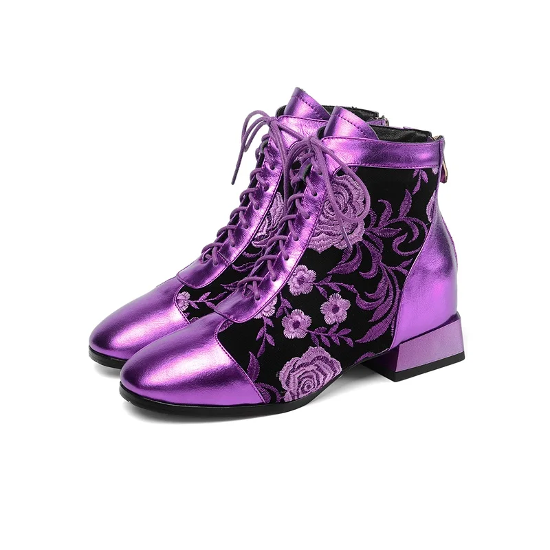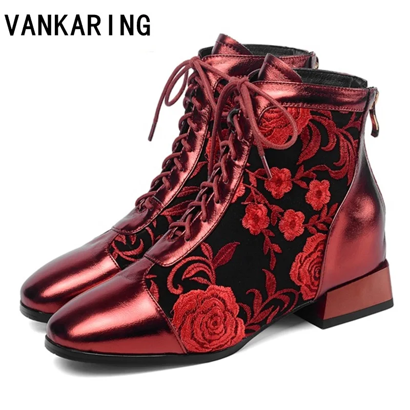 Special Offer Retro koronka up kobiety krowa skórzana w połowie obcasy botki w stylu etnicznym kwiat wzór fioletowy czerwone kostki buty kobieta buty Discount 45% Today!